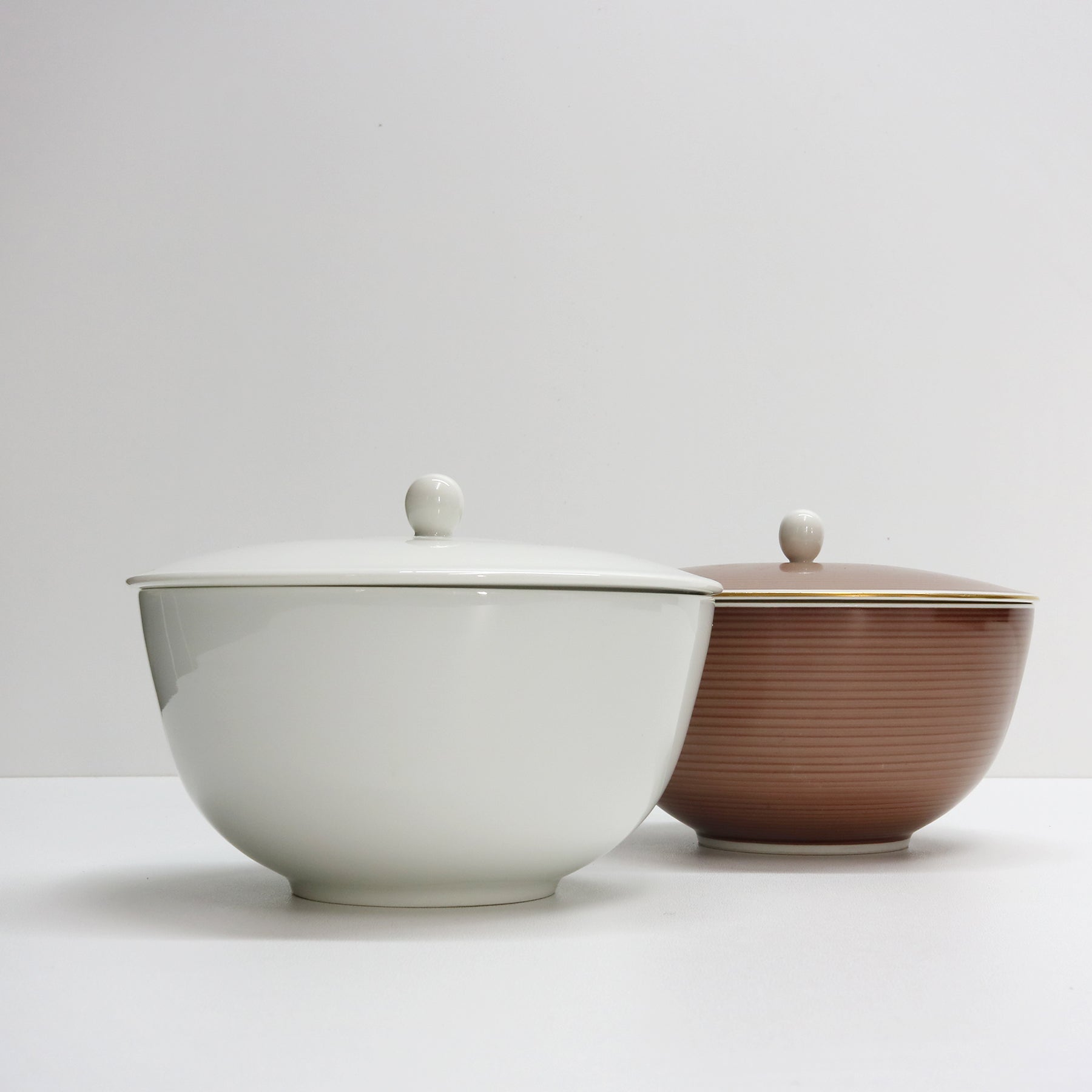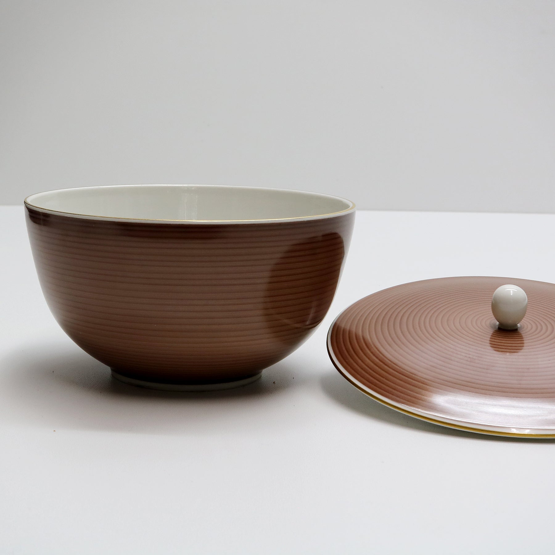 white or rosewood brown striped background and gold rim, white inside