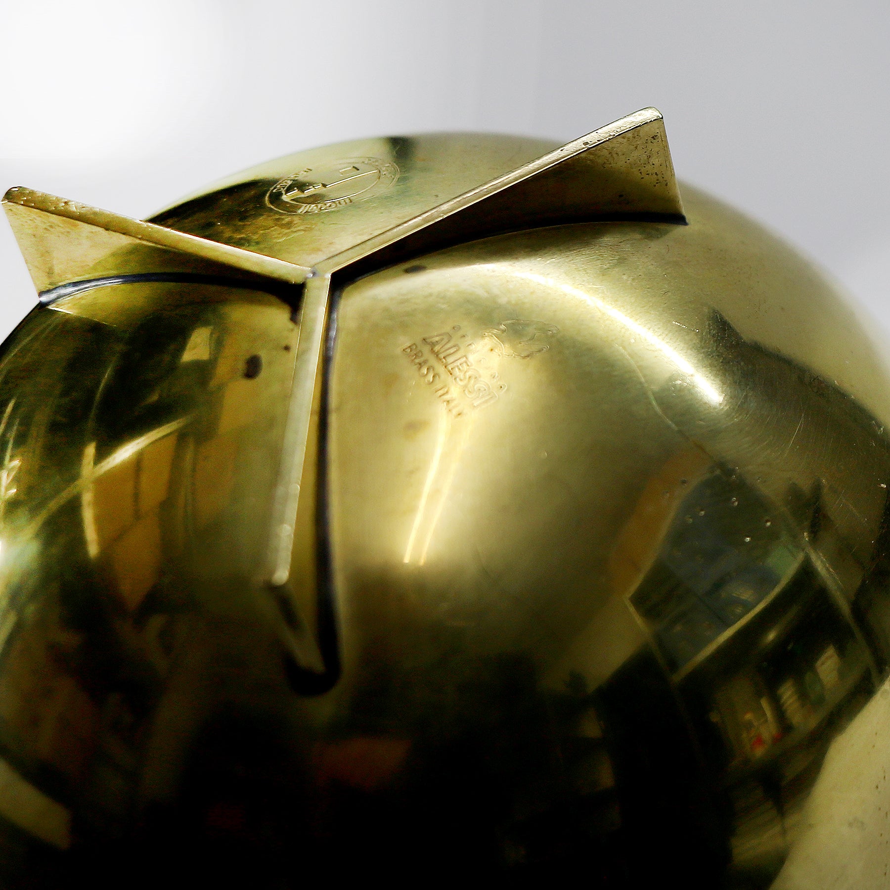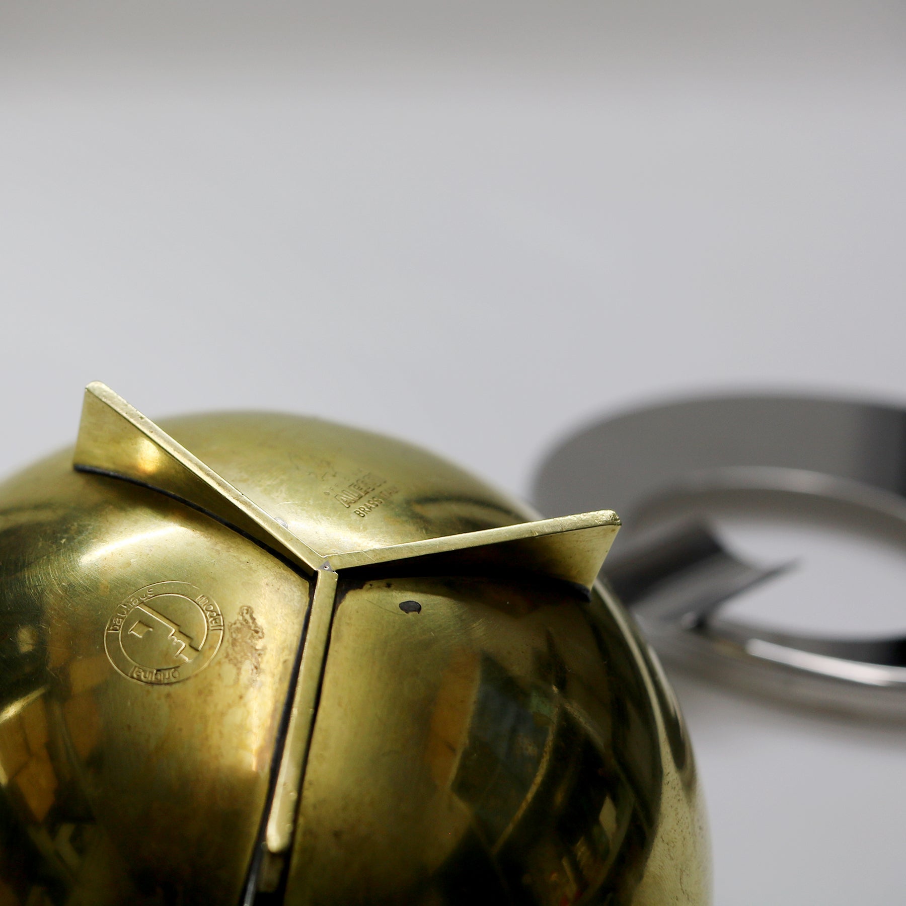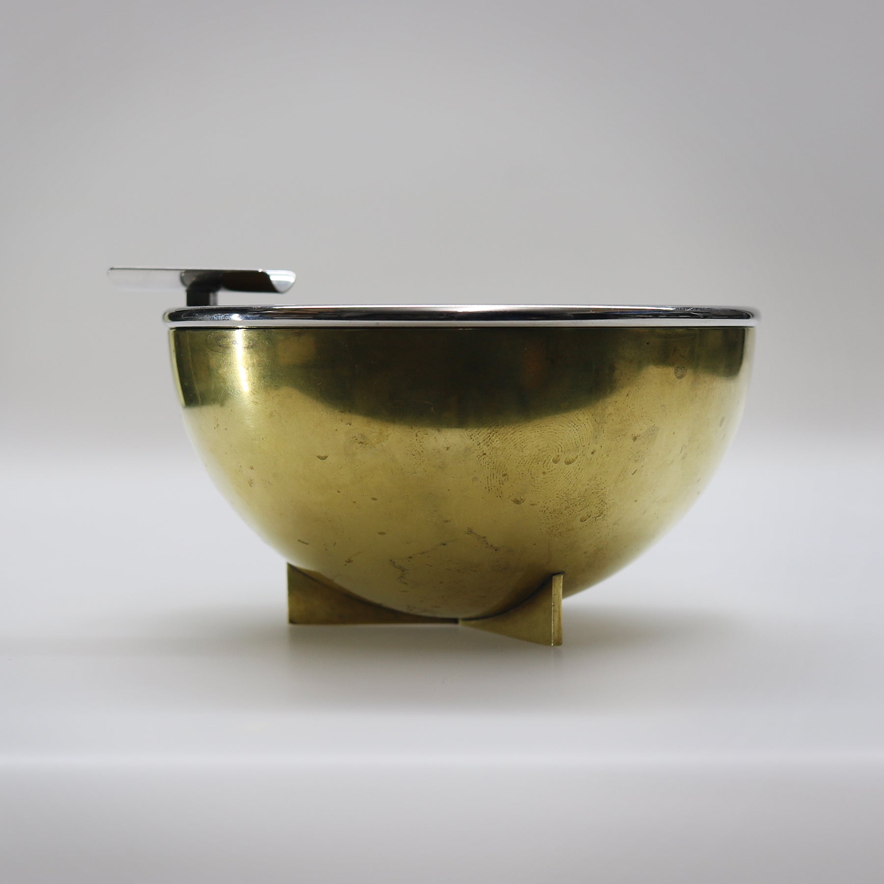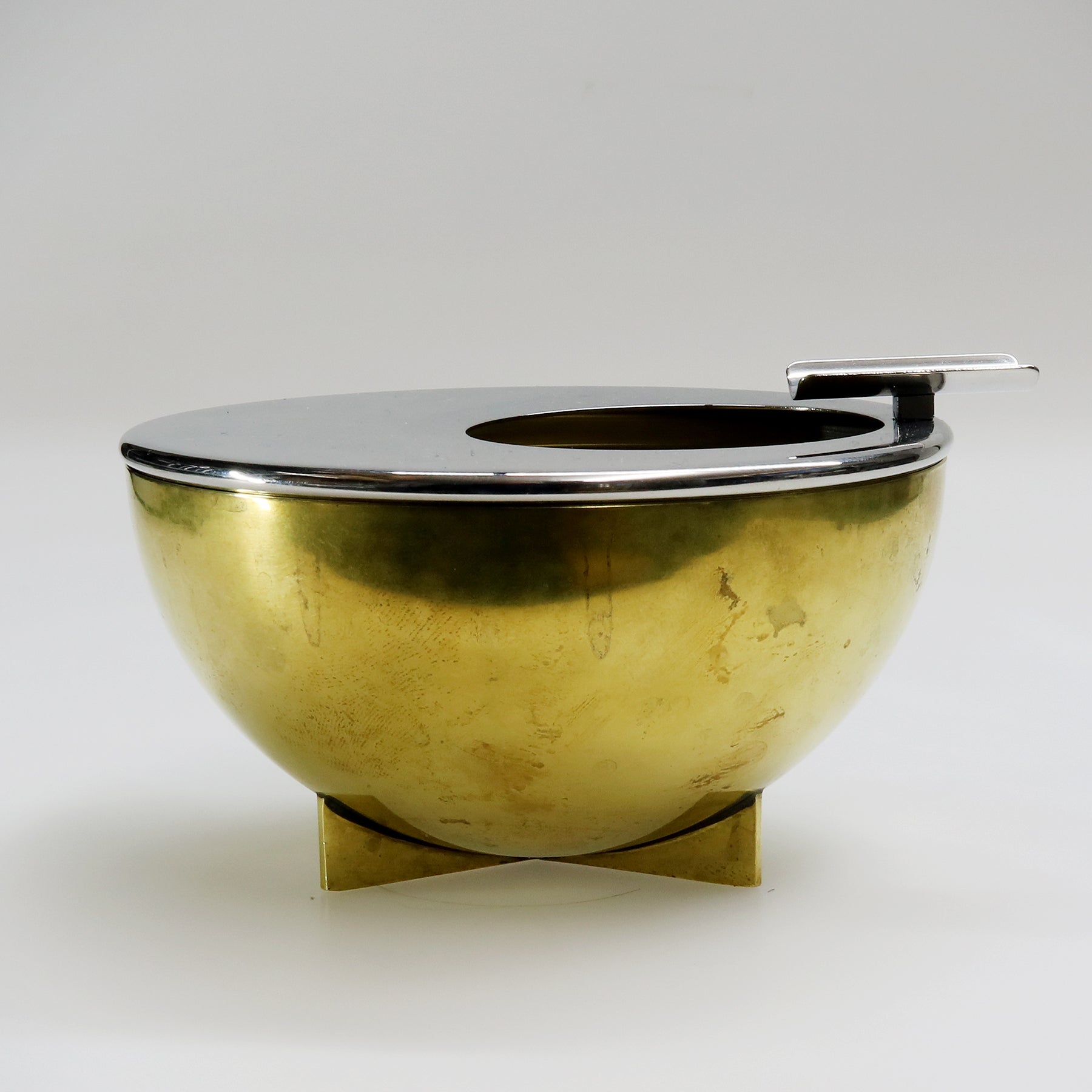 Einer der früheren Entwürfe von Marianne Brandt (1893 -1983). Entworfen 1924 am Bauhaus in Weimar. Eine Halbkugel aus Messing, die auf drei dreieckigen Füßen steht, wird durch einen Deckel abgedeckt. Der Deckel hat einen exzentrischen Ausschnitt für die Asche. Ab 1995 produzierte ALESSI diesen Aschenbecher unter der Lizenz vom Bauhaus-Archiv